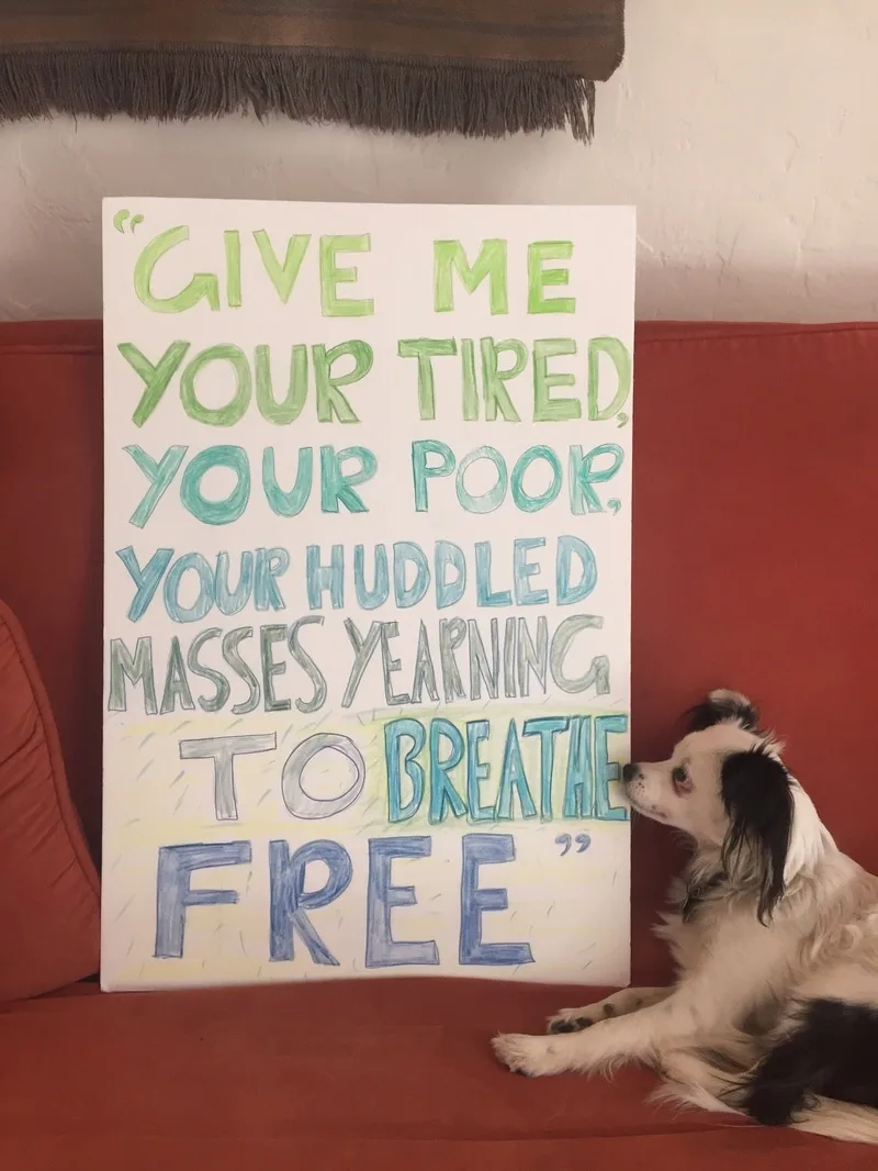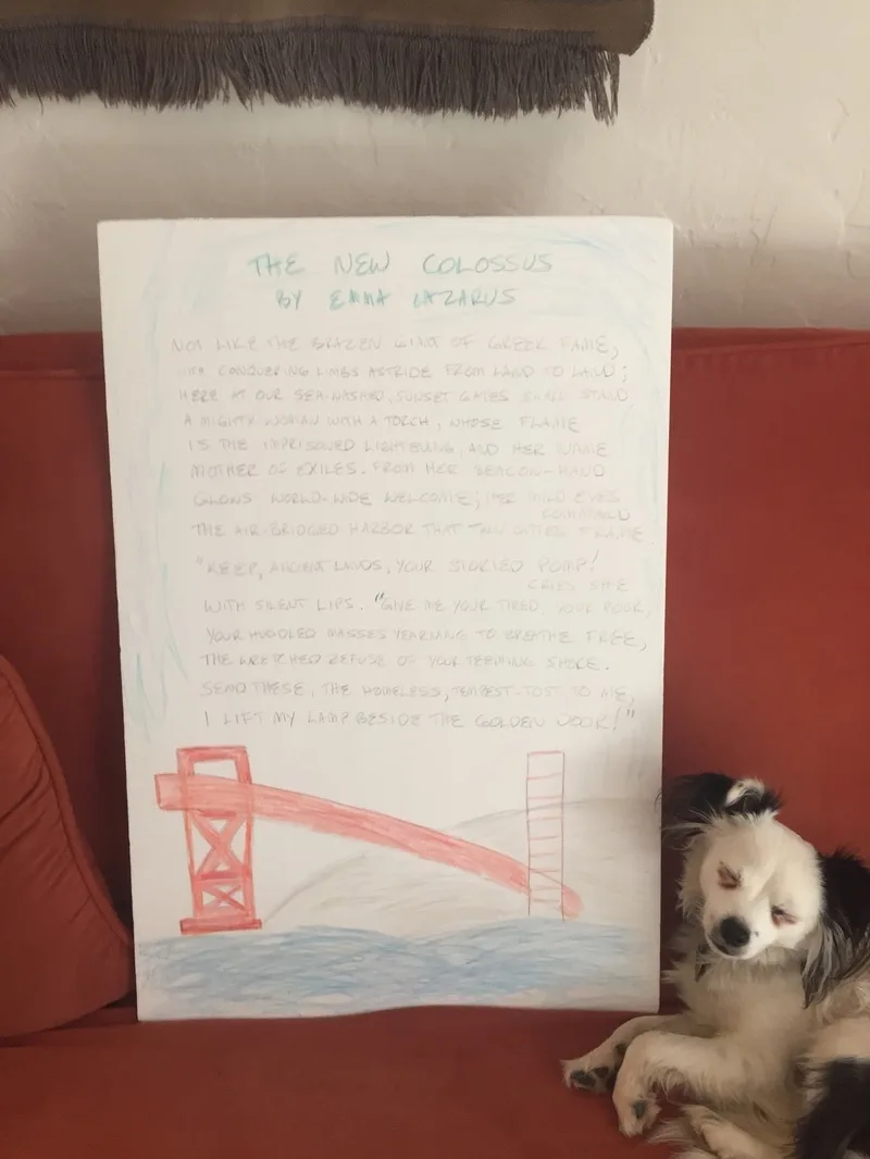 Emma Lazarus''s full poem "The New Colossus" on the back of the sign.