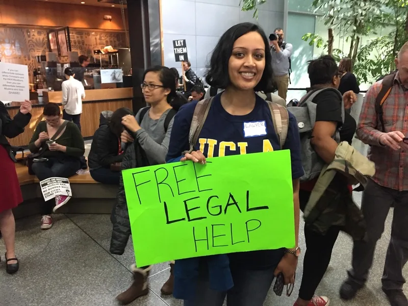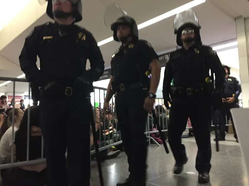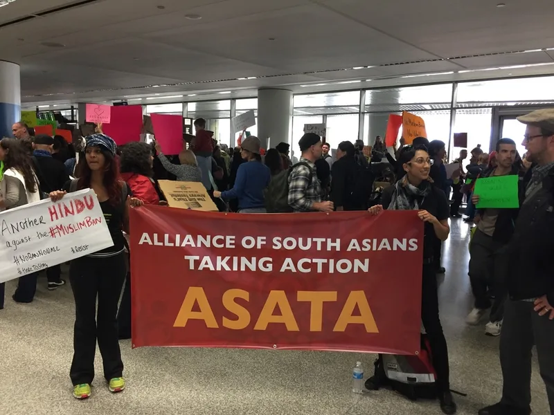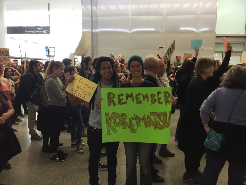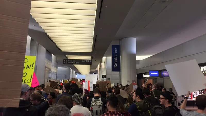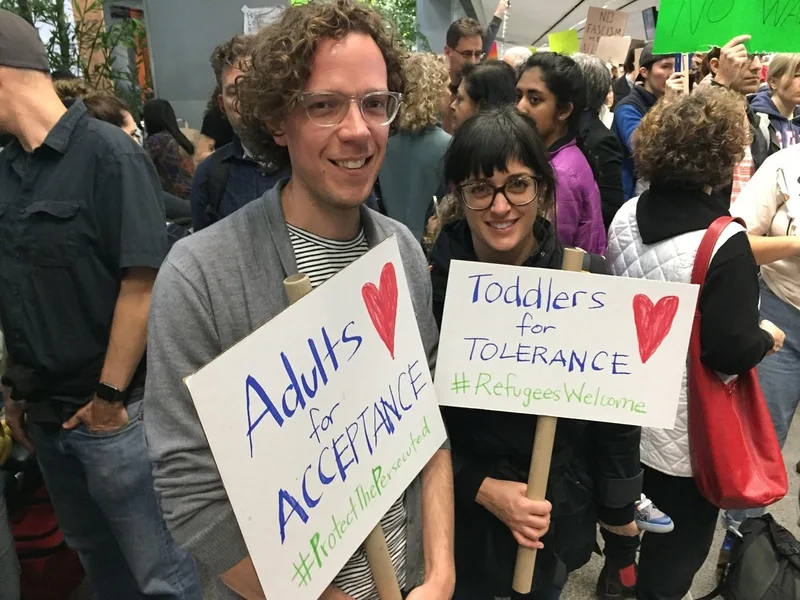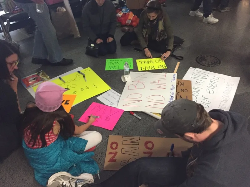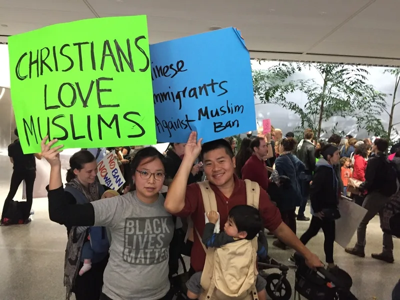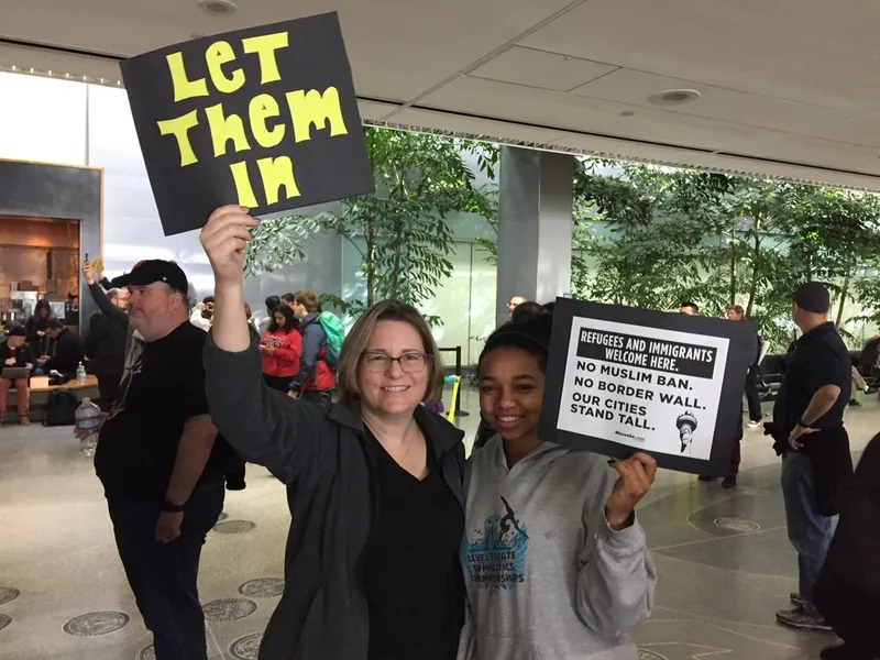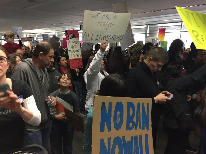 Marching & chanting: "No Ban, No Wall, Sanctuary for All!"